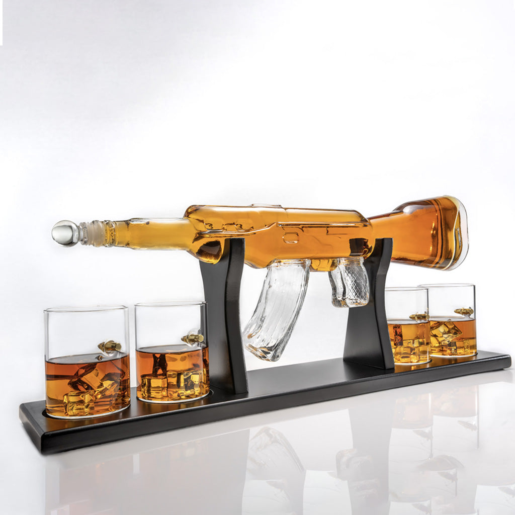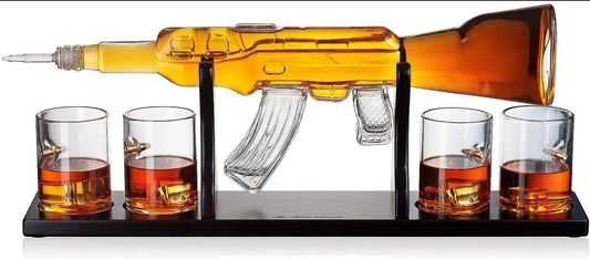 Elegant Rifle Gun Whiskey Decante 1000ml With 4 Bullet Whiskey Glasses and Mohogany Base